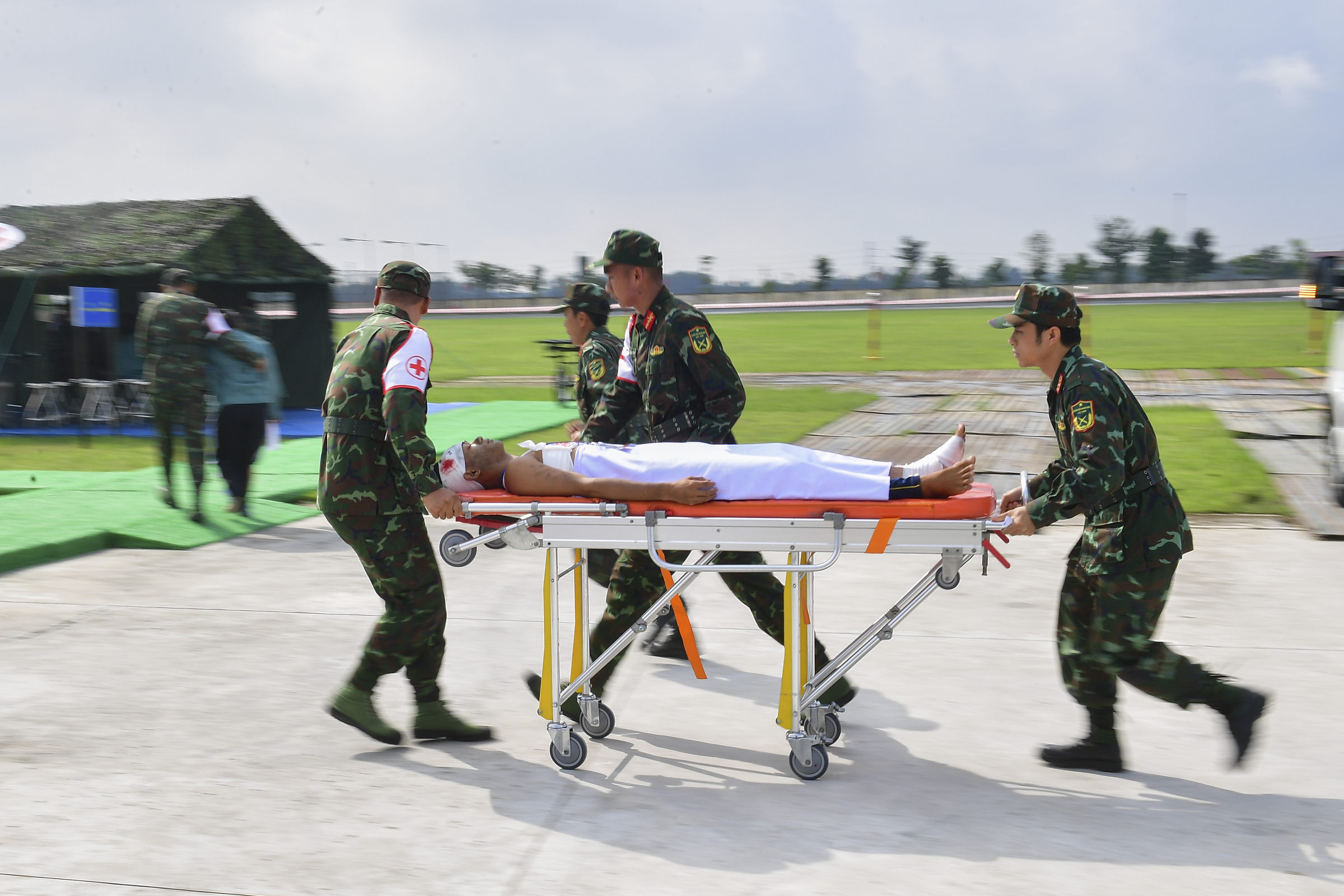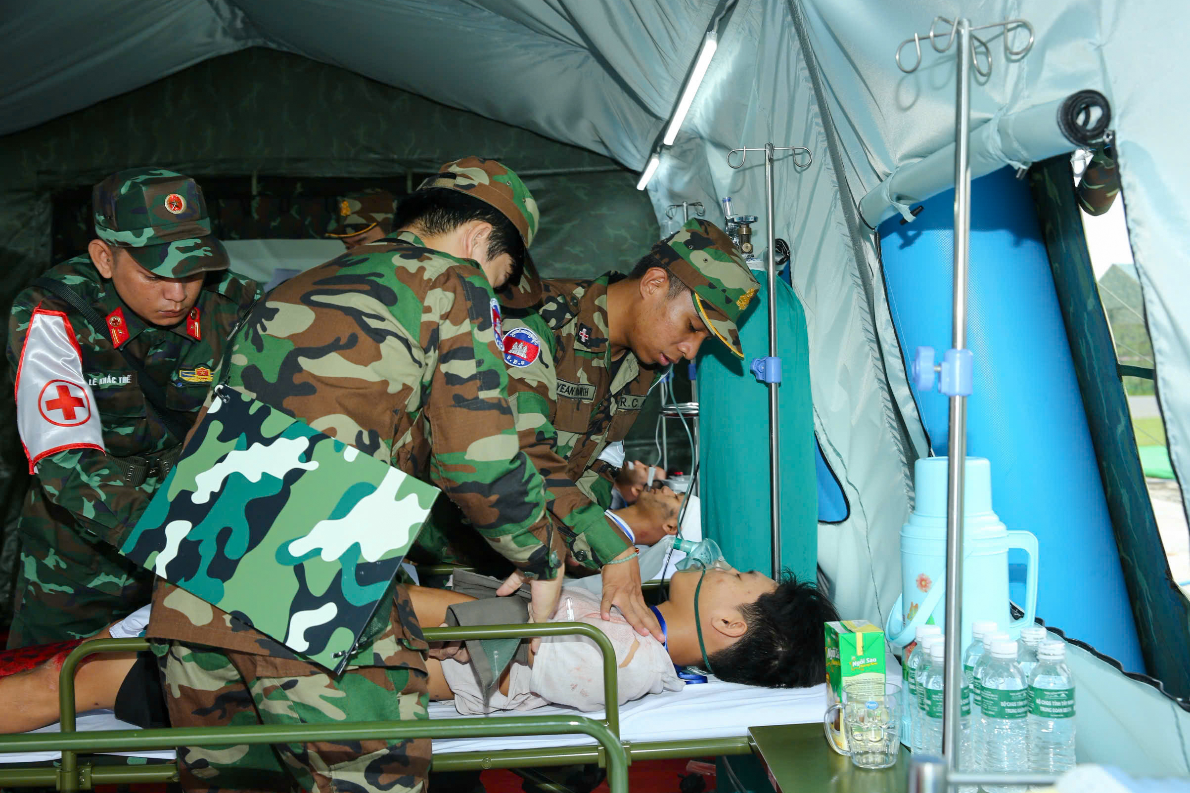 Trong tình huống giao thông đường bộ và đường thủy bị chia cắt, hai trực thăng vận tải cứu hộ cùng nhiều xe cứu thương đã được huy động để kịp thời đưa người bị nạn đến trạm dã chiến. Quân y hai nước đã phối hợp diễn tập vận chuyển nạn nhân bằng cáng, thực hiện cấp cứu tại bệnh viện dã chiến cách hiện trường khoảng một km. Sau khi được sơ cứu, các nạn nhân được đánh giá, phân loại để chuyển đến các tuyến điều trị phù hợp, bao gồm cả việc sử dụng xe cứu thương và trực thăng cho các ca nặng.